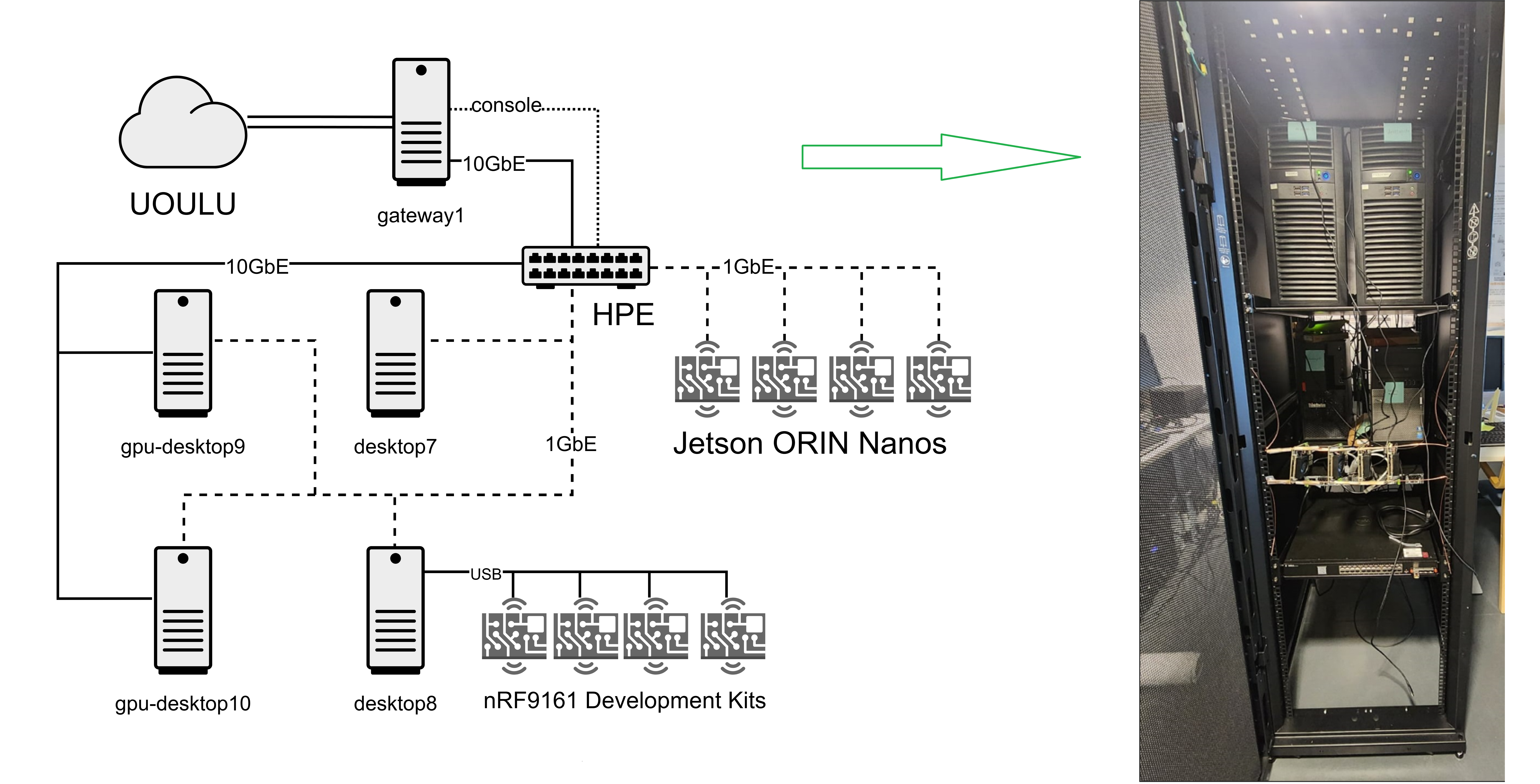 Live rack with a 10 GbE gateway (ONOS controller + console), 1 GbE access switch, GPU/compute servers, and SBC rows (Jetson/Raspberry Pi). Used for real-time deep-learning pipelines and intent-based traffic steering over Wi-Fi/Ethernet.